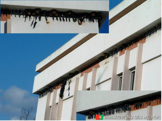 Tribunal de Grândola. A ideia é que as andorinhas não façam ninho (quase que resulta), e consiste em colocar uns fios (tipo estendal) com uns plásticos pretos para afugentar as andorinhas. Não parece resultar, mas… que fica feio fica!