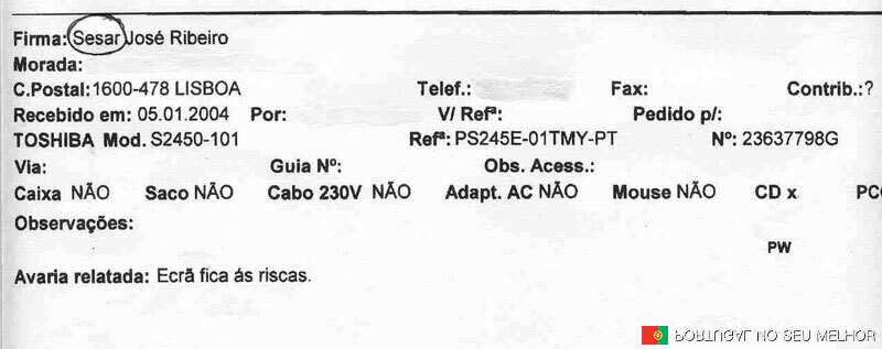 Meus amigos,vamos acabar com um equívoco:não existe nenhum "sécar" nem "sesar",nem raio que o parta;esta factura existe porque o caso passou-se directamente comigo.Eu fui (em nome próprio) ao representante da marca "........" em Portugal levar um portátil para reparar e no talão de entrega levei com esta encomenda do "Sesar".Como todos os talões são iguais,não interessando se são para uma firma ou para um particular,é natural que apareça antes do nome próprio a tal "firma".