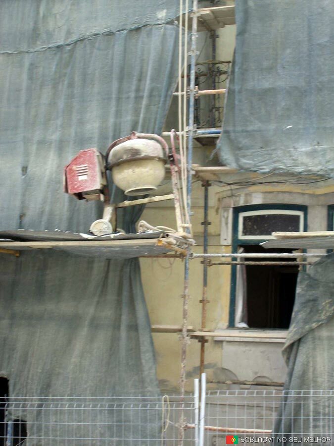 Encontra-se na Rua Heliodoro Salgado, aos Anjos, em Lisboa. Quem foi o génio que teve a ideia de colocar uma betoneira à altura de um 1º andar, nesta posição periclitante?!? Só neste país…