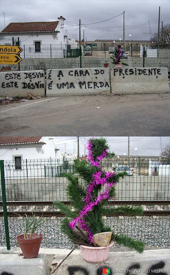 Depois da mensagem no muro, os habitantes de Grândola decidiram dar o Feliz Natal ao Sr. Presidente, através dessa pequena árvore. Apesar de estar num penico, o que conta é a intenção. As cebolas ao lado devem ser a prenda.