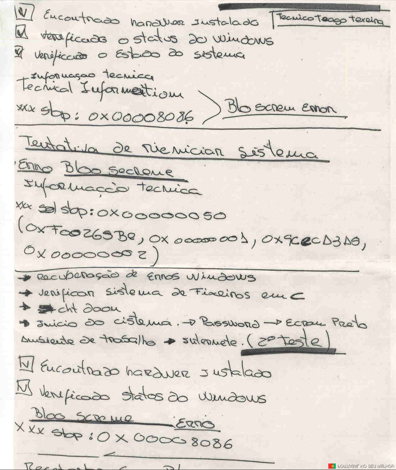 Eis uma folha escrita por um funcionário da Worten, a relatar os problemas de um portátil que foi enviado para reparação.
