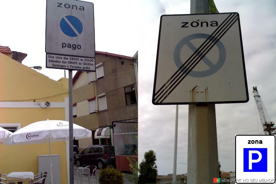 Esta placa encontra-se nas proximidades do porto de Leixões. Indica-nos aquilo que é representado no resto do país pelo sinal de parque (no canto da imagem) mais a inscrição “pago”. Mas como é no Porto é diferente.